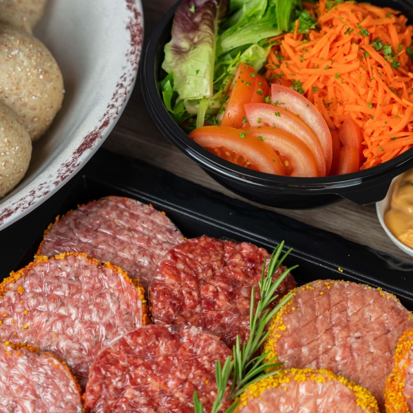 Inclusief btw5 minibroodjes, 5 soorten burgers, sla, tomaat, wortel, komkommer, bicky ui, rode ui, sneetjes kaas, sneetjes spek en sausjes